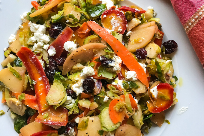 - Lava y seca las coles de Bruselas, corta la base y pártelas por la mitad a lo largo. Colócalas con la parte plana hacia abajo y córtalas en rodajas finas. Pela las zanahorias y córtalas en tiras anchas con un cuchillo o mandolina. Parte la manzana y córtala en láminas finas.