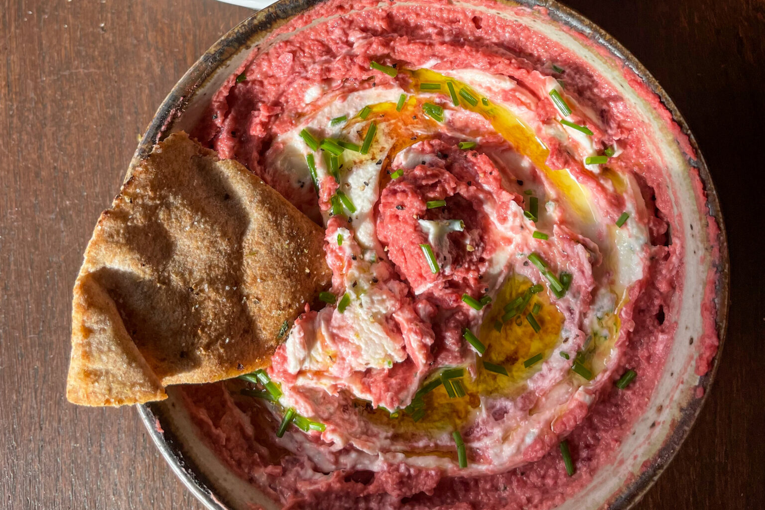 Hummus de remolacha con queso de cabra y chips de pita caseros