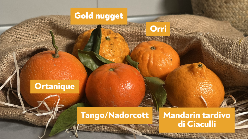 Orogros: Es de tamaño medio/grande, con una piel que varía de amarillo a naranja. Su sabor es una mezcla equilibrada de dulzor y acidez. La piel es algo más gruesa que la de una mandarina normal, pero sigue siendo fácil de pelar. La temporada de recolección de la Orogros suele ser de enero a marzo.